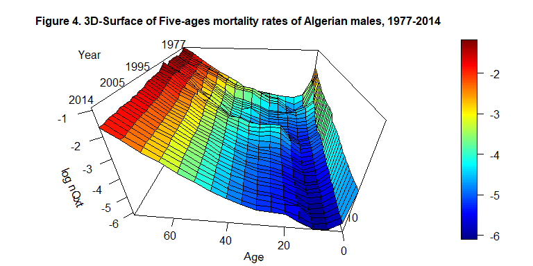 persp3D(x=c(0,1, seq(5,75, by=5)), y=c(1977:2014), z=log(as.matrix(Bxt)), phi = 30, theta = - 175, border = "black", facets = TRUE, inttype = 1, add = F, ticktype = "detailed", expand = .6, scale=1.5, r=.6, box=TRUE, xlab="Age", ylab=NULL, zlab="log nQxt", plot=F, axes=T, main="Figure 4. 3D-Surface of Five-ages mortality rates of Algerian males, 1977-2014", cex.main=1 )