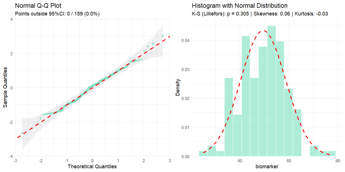 #> 20 002 10 Female B 72 NA NA <NA>Generates a summary table for biostatistics and clinical data analysis with automatic normality, effect size, and statistical test calculations. Handles both numeric and categorical variables, performing appropriate descriptive statistics and inferential tests for single-group summaries or two-group comparisons.