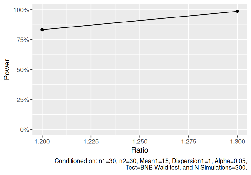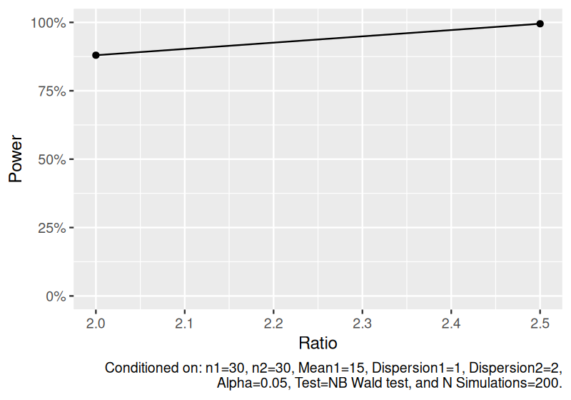 #> n1 n2 mean1 mean2 ratio dispersion1 distribution nsims test alpha power