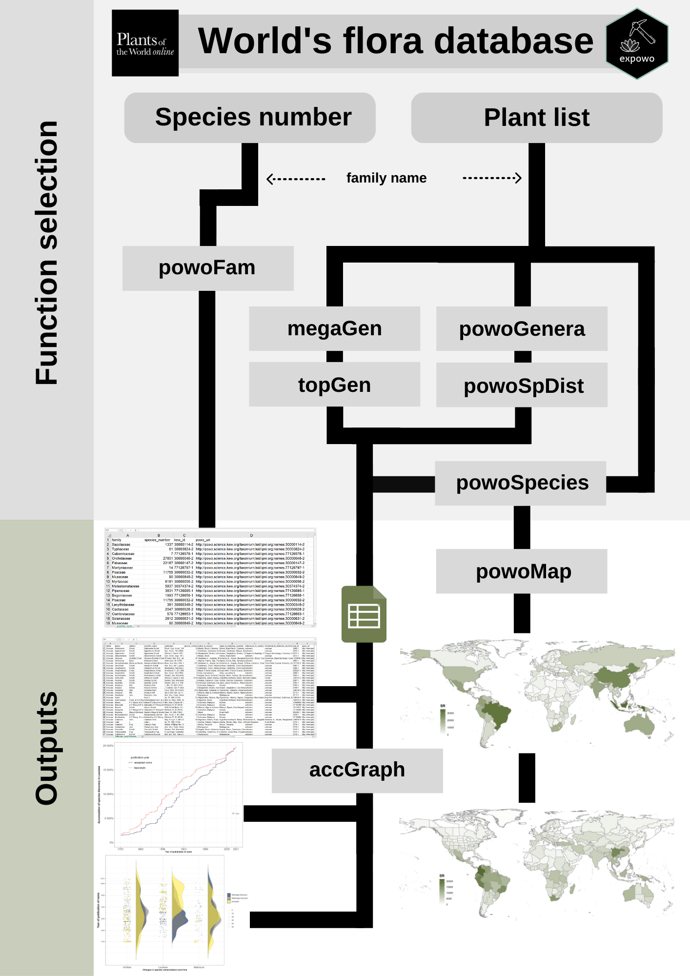 The package’s major functions (powoFam, powoGenera, powoSpecies, powoSpDist, megaGen, and topGen) only require the name of the target family (or a vector with multiple family names). These major functions work with other minor functions (getInfo and saveCSV), with auxiliary and defensive functions to mine the plant data. Respectively, getInfo mines the taxonomic information of each genus, the total number of species within any genus, and does a complete search for native and introduced country-level distribution for any genus and species, while saveCSV fastly writes CSV files within the current date subfolder of a provided specific directory. With these extracted distributions, it is also possible to automatically generate global maps according to political country and botanical countries with the function powoMap. Additionally, if you want to plot new species discoveries within any genus after downloading the data using powoSpecies, it is also possible to do it automatically using accGraph. See the examples on how to use the expowo’s functions for mining and using data regarding the global plant diversity and distribution in the ‘Articles’ section in our site.