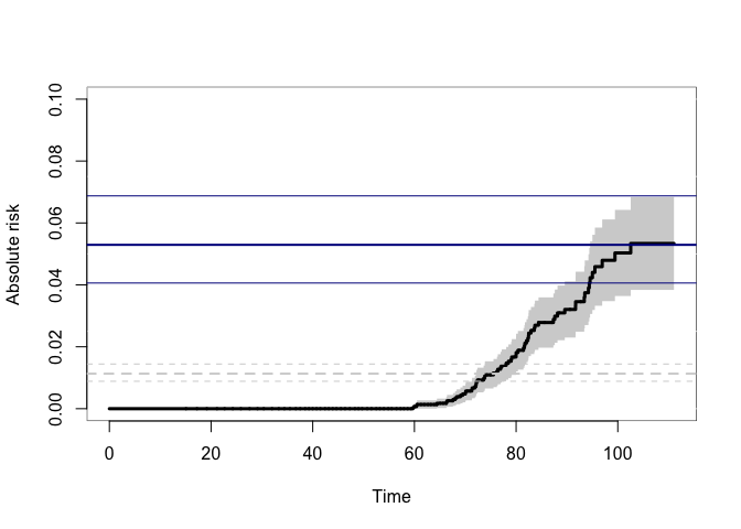 out1 <- resmeanATE(Event(time,cause)~tcell+platelet,data=bmt,cause=1,time=40,