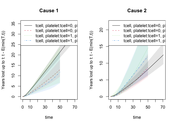 Here event is 0/1 thus leading to restricted mean and cause taking the values 0,1,2 produces regression for the years lost due to cause 1.