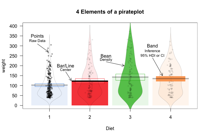traditional plots, like barplots and boxplots, the pirateplot shows both